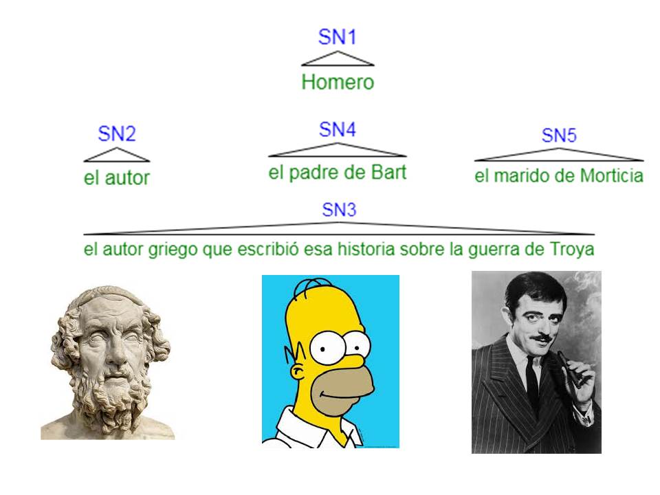 Un sintagma es la proyección o la expansión de un núcleo. Es el núcleo el que determina la categoría sintáctica del sintagma. El SN1 Homero puede utilizarse para referirse a un poeta griego como el SN2 o SN3, a Homero Simpson (SN4) o a Homero Adams (SN5), o incluso, a mi perro. Es decir que semánticamente se refieren a distintos individuos.